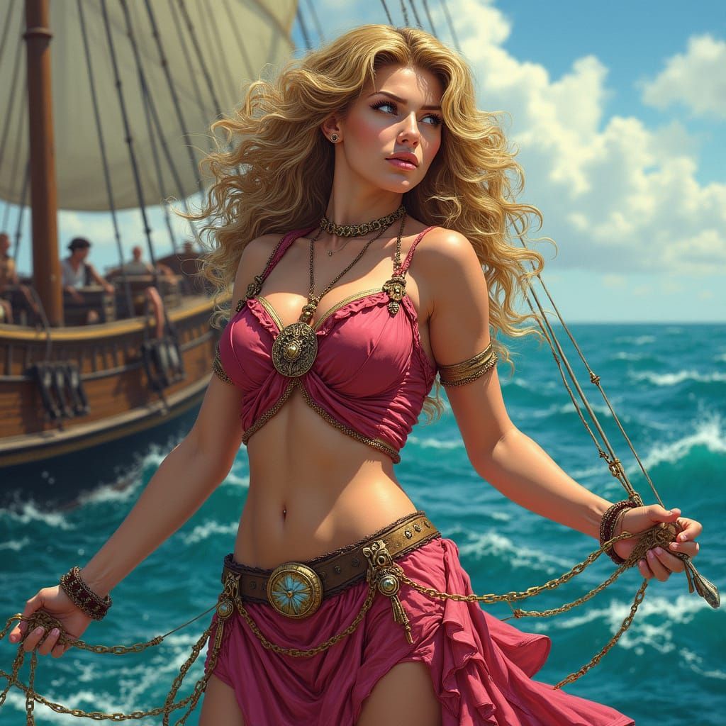 A stunning comic book-style image of a golden-haired Greek explorer bound to the ship's mast, surrounded by her crew rowing with force in the midst of a vast ocean, with precise details and smooth textures.