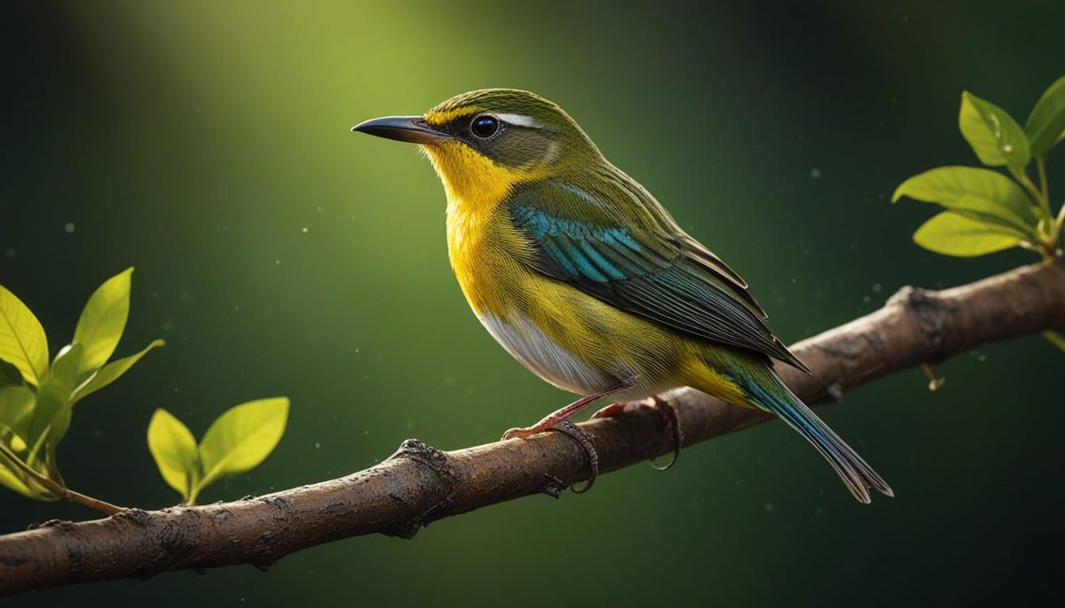 This image showcases a hyperrealistic, intricately detailed splash art illustration of a yellow-throated spadebill bird perched on a branch. Features vibrant plumage, dramatic lighting, and sharp focus.
