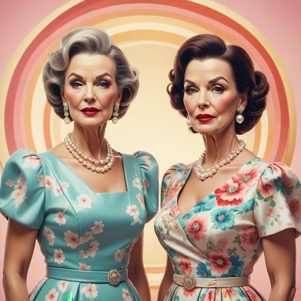 This image shows two mature housewives standing in retro concept art. They are wearing period clothes and glossy lipstick, accentuated by soft, warm side lighting and a pastel background.