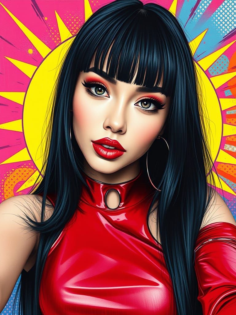 This image shows a stunning woman with sleek black hair and a bold, red latex top, set against a vibrant pop art background with graphic patterns. Created in a hyperdetailed charcoal drawing style.
