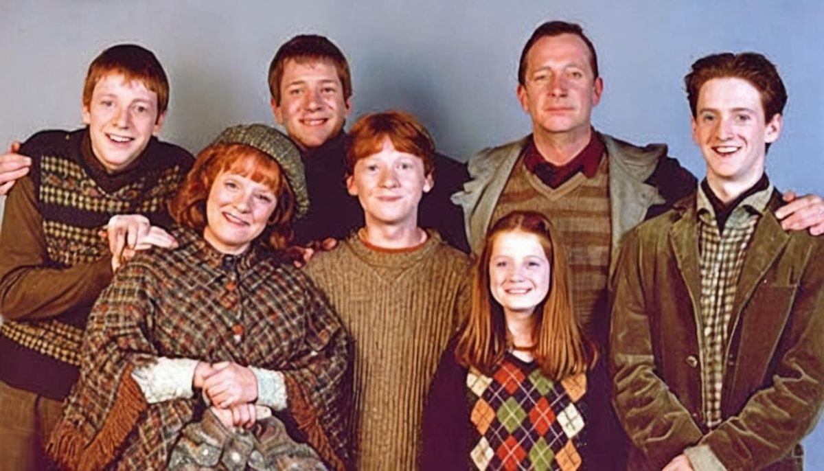 This image shows the Weasley family, known from the Harry Potter series, in a group portrait. The depiction captures the essence of the close-knit magical family.