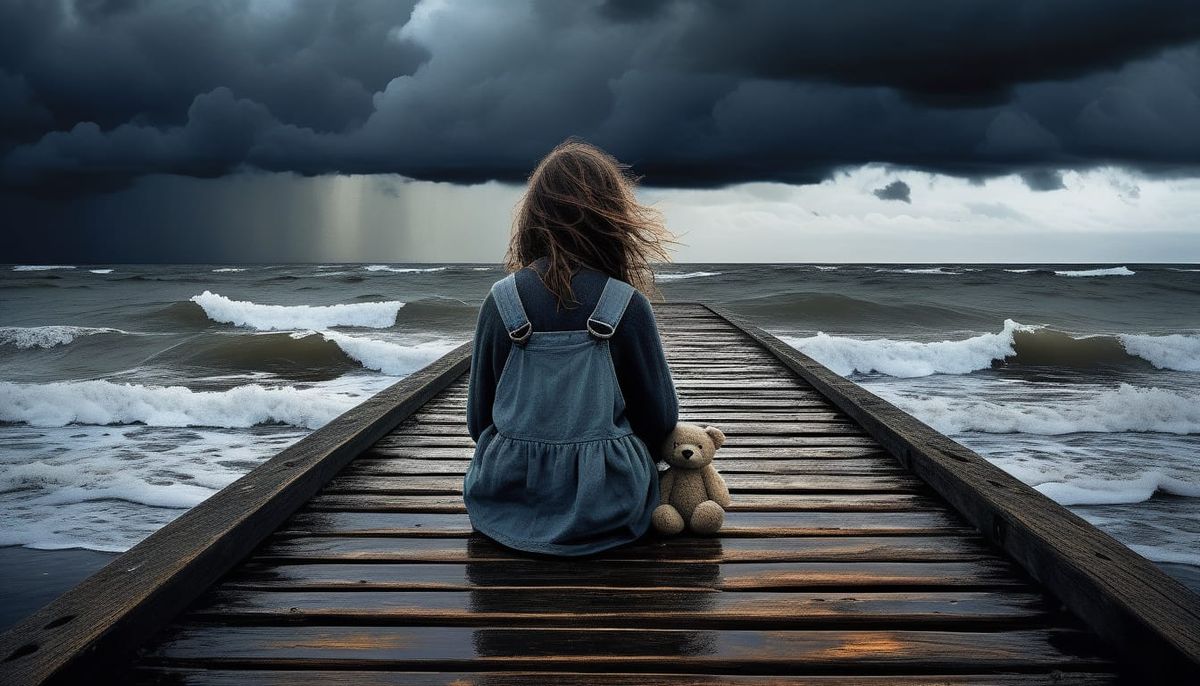 A striking picture of a solitary girl sitting on a pier with a teddy bear. The image evokes a reflective mood with stormy skies and dramatic lighting, rendered as an impasto painting.