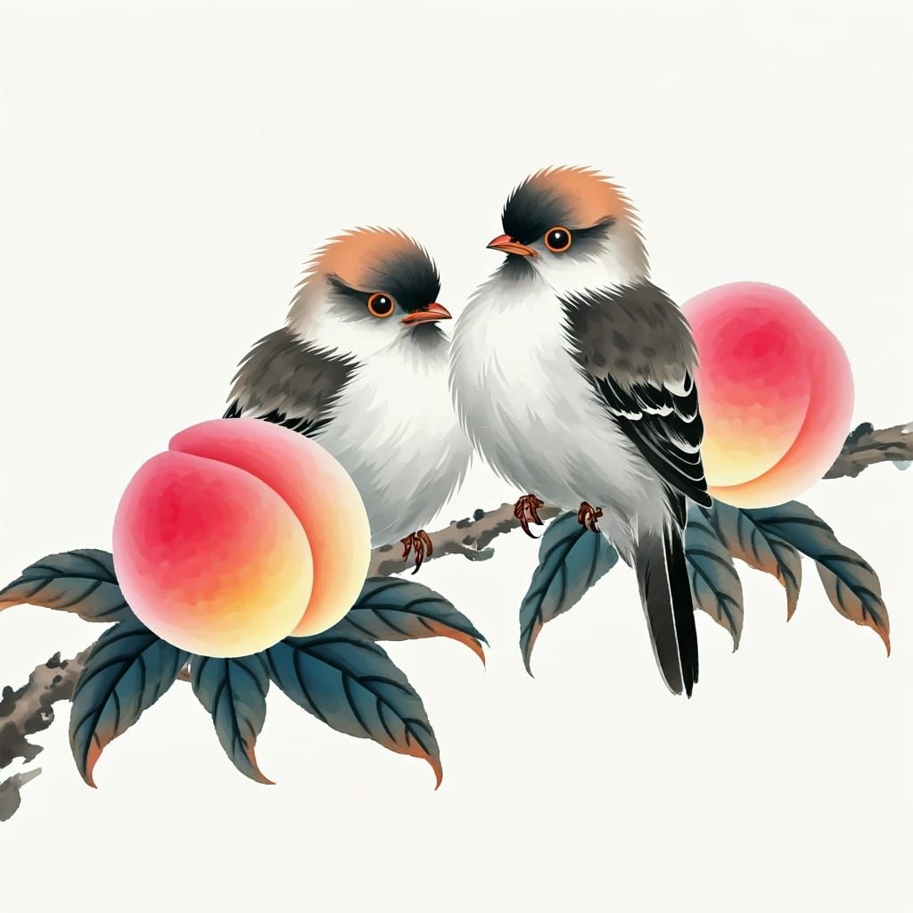 This image shows two birds perched on a peach branch. The artwork is reminiscent of traditional Chinese ink paintings, with soft colors and expressive brushstrokes.