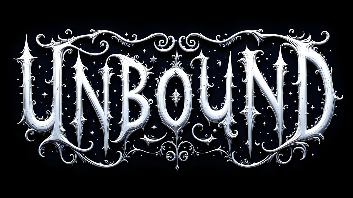 This image displays the word "UNBOUND" with striking backlighting, creating a dramatic visual effect with illuminated edges.