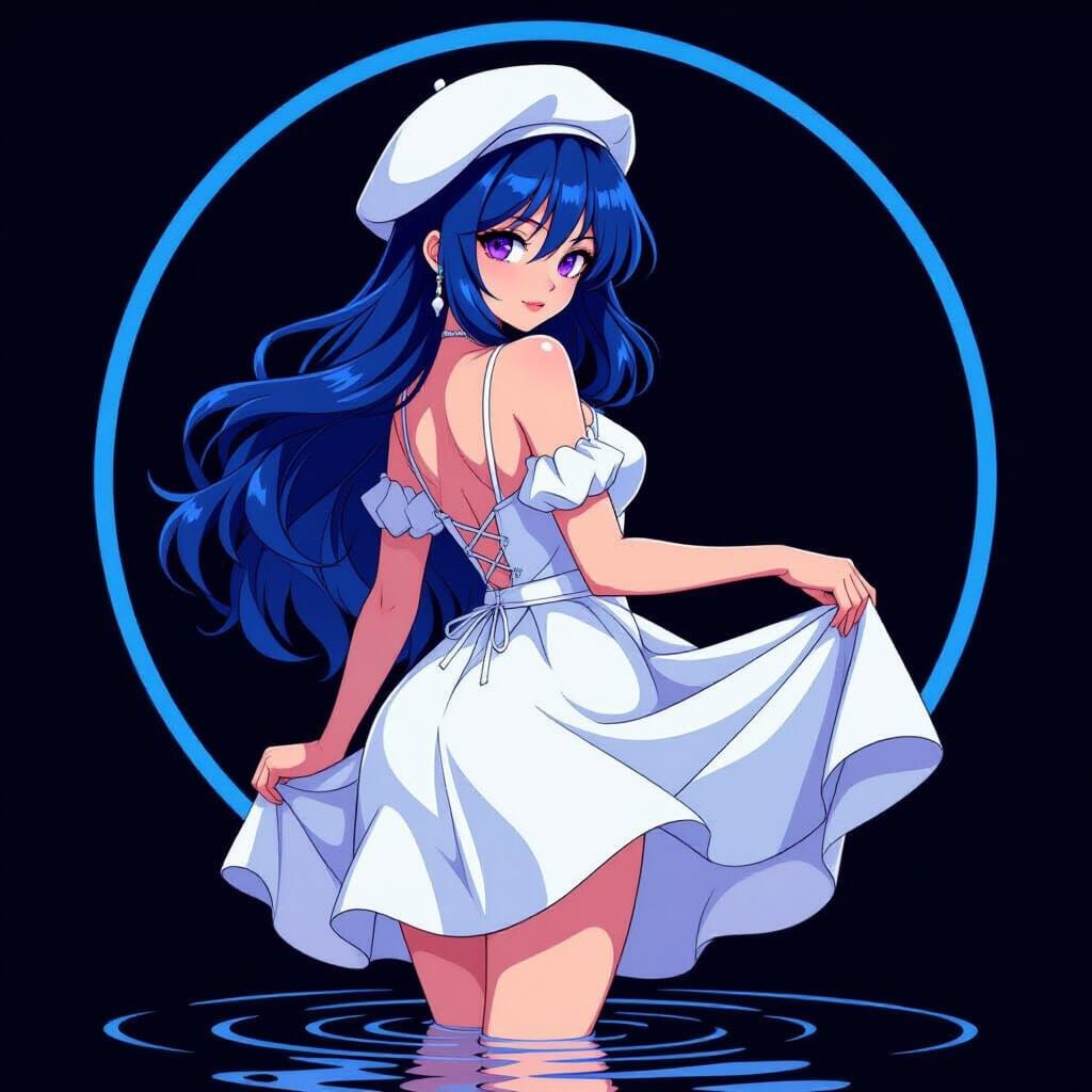 A digital art image shows a petite woman with blue hair in a white dress, glancing back. She stands in water against a dark backdrop, rendered with cel shading and a limited color palette in a Honkai Impact 3rd style.