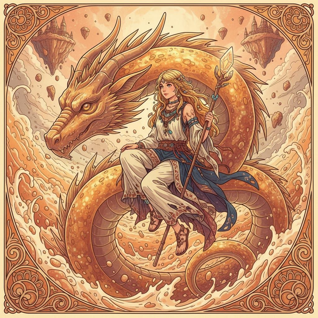 This image shows a woman with golden hair on a giant gummy dragon in a bubbly soda sea. It features warm amber and tangerine colors with linework inspired by art nouveau and imaginative realism.