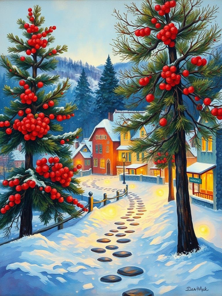 A winter village scene featuring snow-covered pine trees and juniper berries. Golden light illuminates the village in a post-impressionist style with art nouveau touches, rendered as a textured painting.