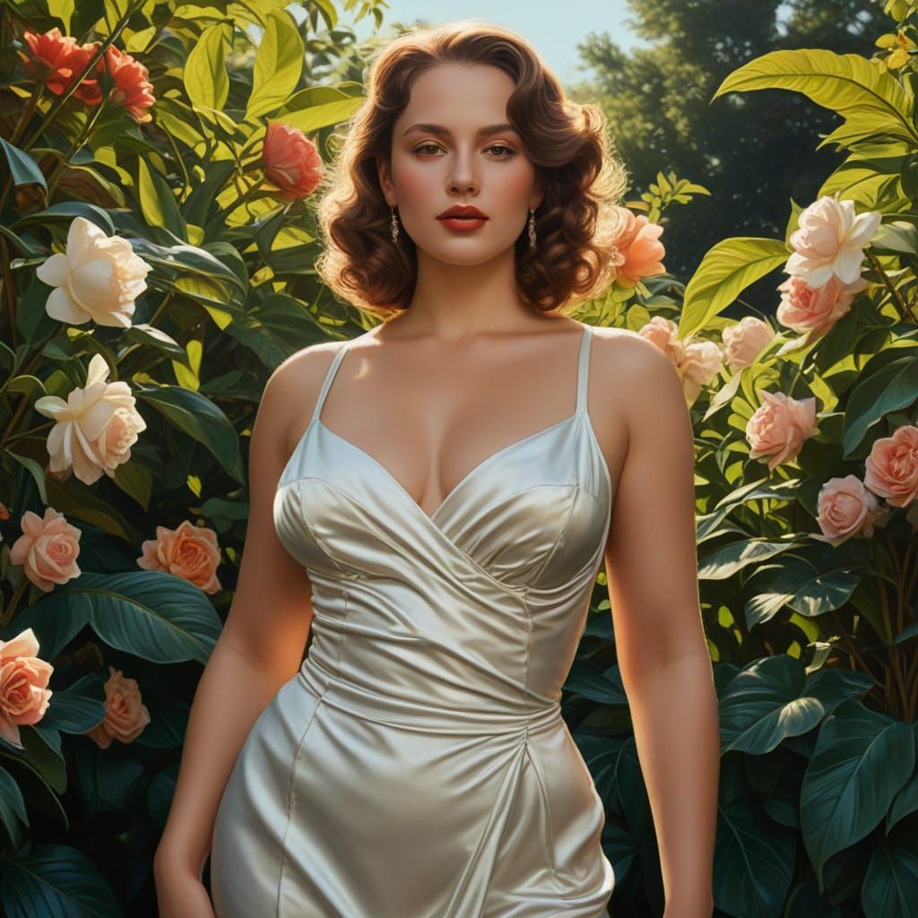 A realistic oil painting capturing a woman with sensuous curves in a vibrant, sun-drenched garden. The artwork features opulent details and warm, golden hour lighting, reminiscent of classic art.