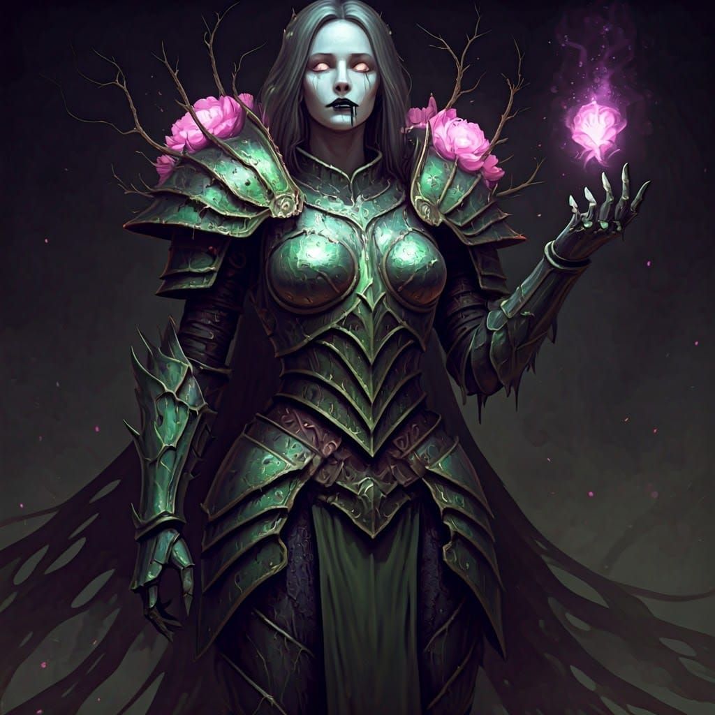 A striking image of a tall, mysterious Fey knight with armor grown into her flesh, entwined with blooming thorns and bioluminescent spores. Her opalescent green and violet lacquered armor shines in the light.