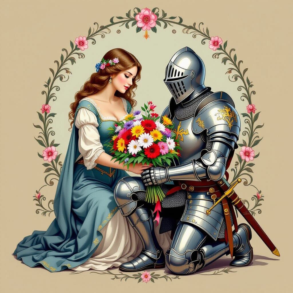 This image shows a knight in shining armor kneeling while holding a flower bouquet. The scene includes a colorful ankle tattoo on a woman and a blurred background.