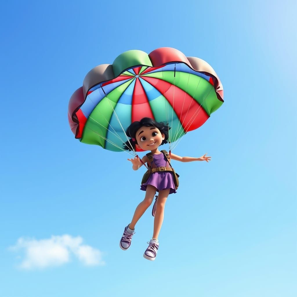 This image shows an 11-year-old girl named Jade in a purple outfit and brown parachute harness flying through a bright blue sky with a colorful striped parachute as 3D rendered digital art.