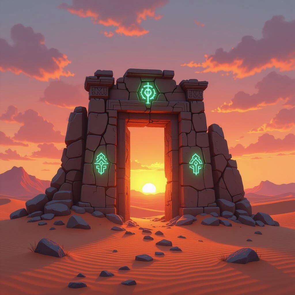 This image shows a ruined temple entrance in a vast desert landscape at sunset. The warm hues and glowing symbols create a mystical atmosphere, reminiscent of 3D animated art.