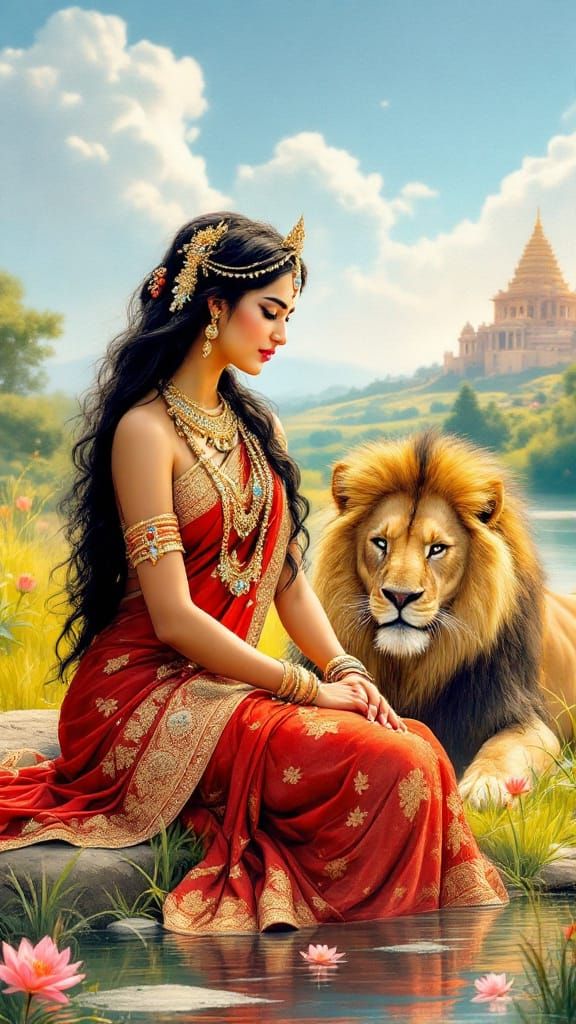Generate your own stunning watercolor images of Mata Rani and lions, easily and for free with our AI.
