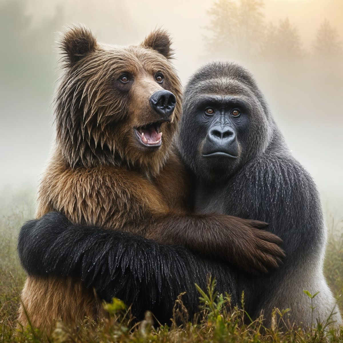 A telephoto image captures a fuzzy, surprised grizzly bear covered in dew hugging a silverback gorilla in a misty meadow. The animals appear both excited and sarcastically threatened.