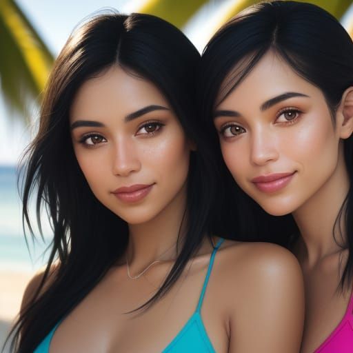 This image showcases two beautiful Italian girls, captured in a warm and inviting portrait photography style, with a focus on their bright smiles and colorful bikinis, set against a soft and ambient background.