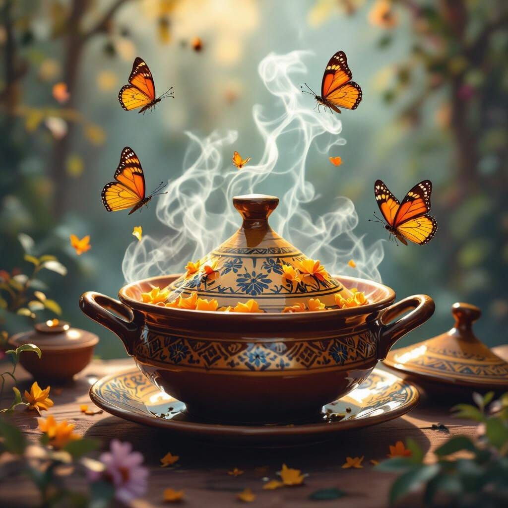 This image depicts a warm, aromatic tagine with saffron-colored steam. Delicate butterflies with iridescent wings flutter around in a whimsical, dreamlike setting, evoking vibrant colors and an ethereal quality.