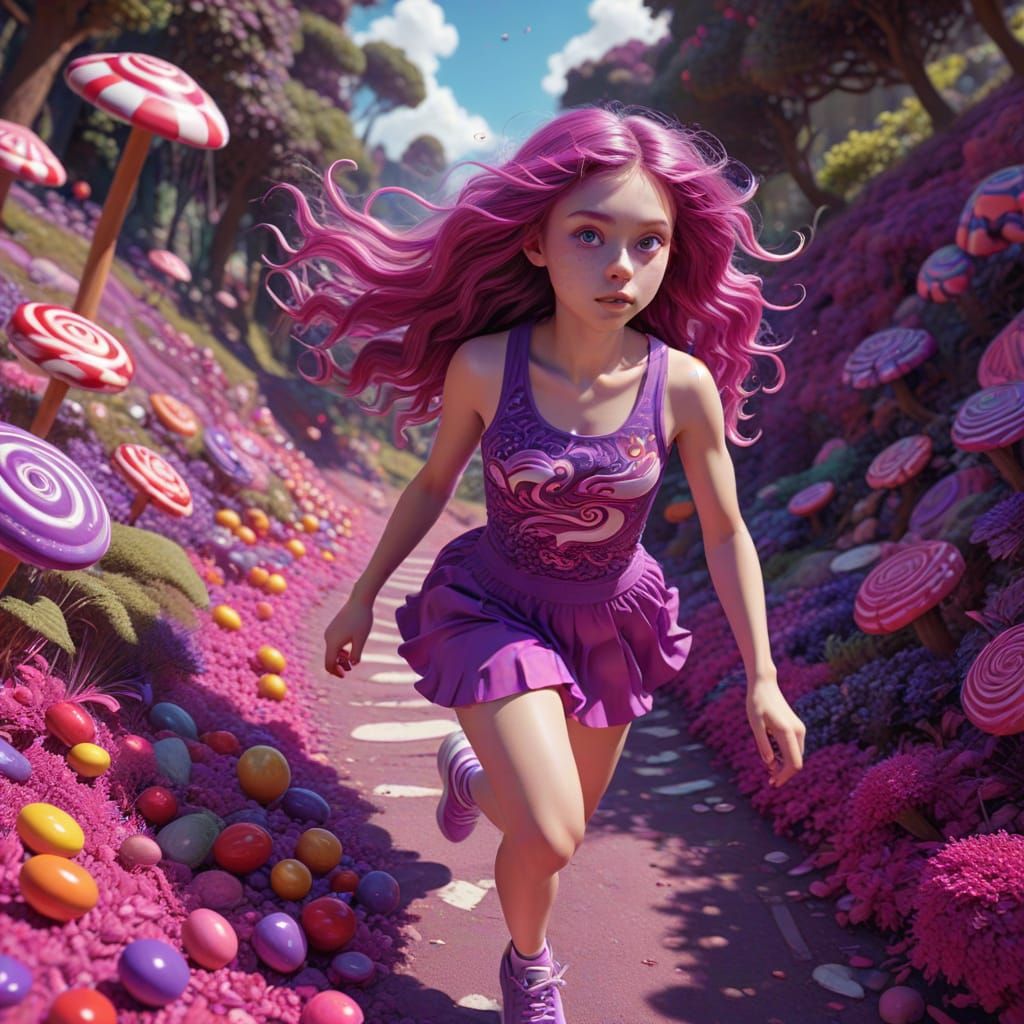 This image shows a teen girl with violet eyes and fuschia hair running down a candy land path. The artwork is rendered in a psychedelic kawaii style with abstract vector fractal and 3D shading.