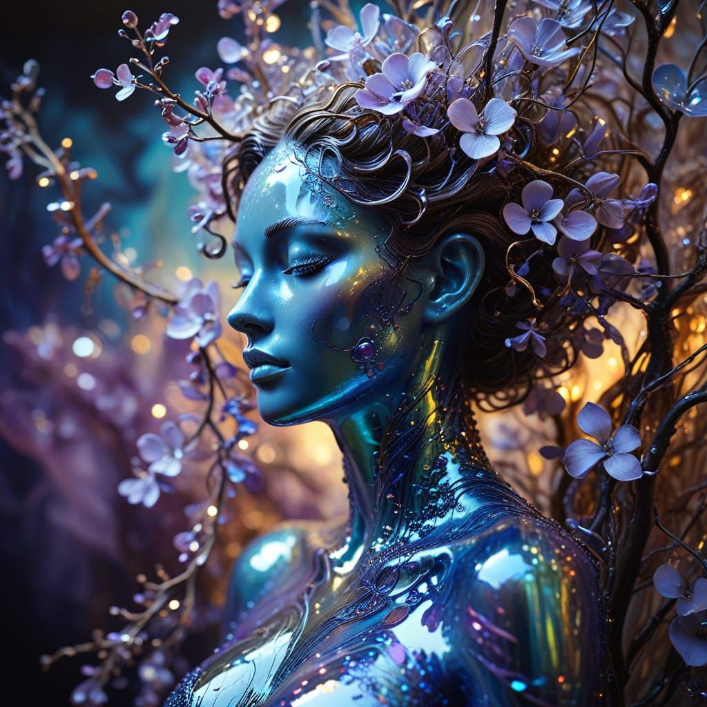 This stunning sculpture depicts a molten glass dryad amidst wisteria blossoms, with iridescent blues, purples, and grays reminiscent of mother-of-pearl, evoking a dreamlike atmosphere and intricate details