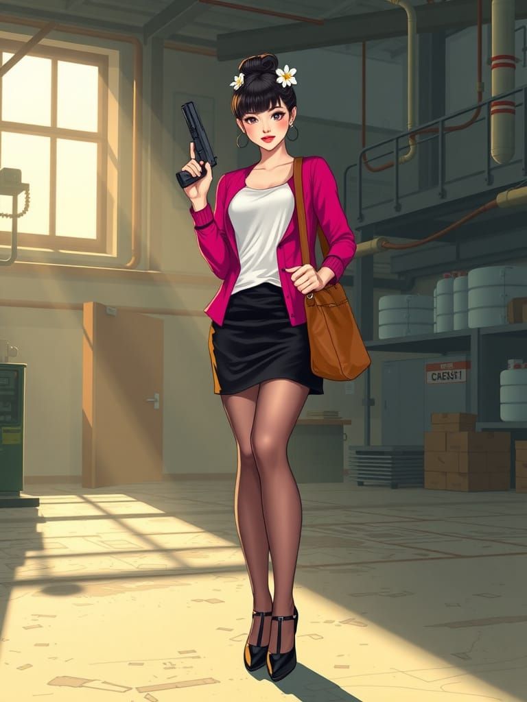 Female spy Baiyun was in a secret chemical warehouse in the late-afternoon. Her gorgeous jade-white legs were clad in sheer black pantyhose and rested in a pair of black closed-toe heels with T-strap and low block heels. Her gorgeous jade-white figure was dressed in a crisp-white round-collar sleeveless chiffon blouse was tucked into a black knee-length skirt, with a fuchsia long-sleeve cardigan draped over her shoulders. Her left hands was holding her handgun while a brown satchel contained her spy gear was slung over her right shoulder. Her black hair was neatly bunned along with adorned with cute and small white-flower hairpins. Her angelic-cute, plump face, framed by soft makeup, featured rosy red lips curved into a slight, endearing smile of excitement and determination.
