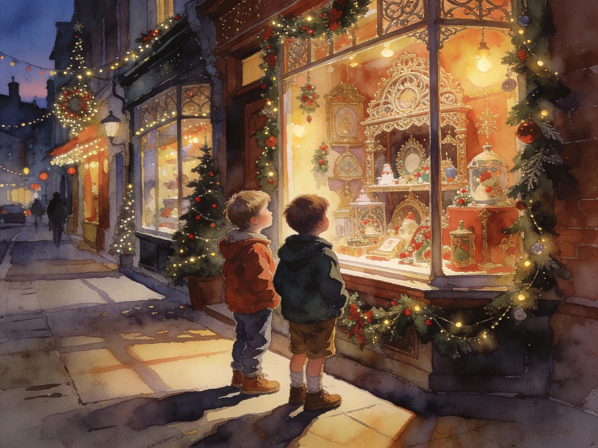 This image shows two boys on a festive street at dusk, captivated by glowing shop windows. Rendered in an intricate, atmospheric watercolor style with warm, soft lighting.