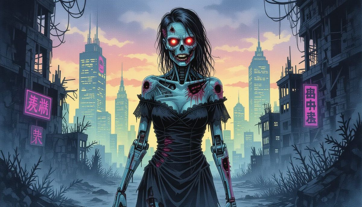 This image shows a cyborg zombie in a tattered dress walking through a desolate cyberpunk city. The watercolor painting style features eerie realism, cinematic lighting, and fine fabric details in black, red, turquoise and silver.