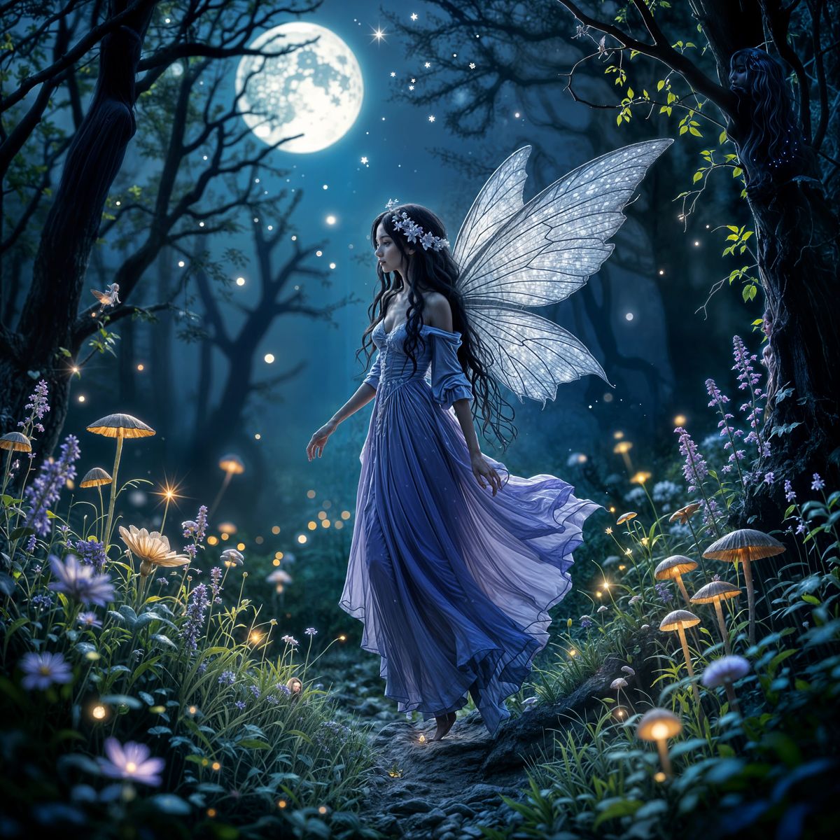 This image shows a beautiful, ghostly fairy with dark hair, wearing lavender clothes and silver wings, floating through an ethereal forest glowing with magical plants and mushrooms under the moon and stars.