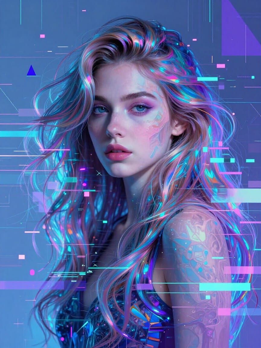 A striking portrait of a woman with iridescent hair, surrounded by glitching artifacts and geometric shapes. Fusion of digital distortion and ethereal fantasy art with vibrant blues and purples.