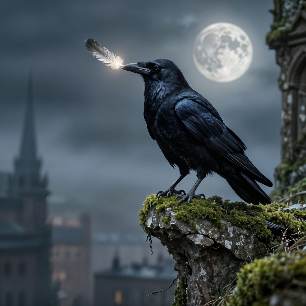 This hyperrealistic dark fantasy image shows a wise raven holding a glowing feather on a mossy gargoyle above a misty cityscape, symbolizing hope.