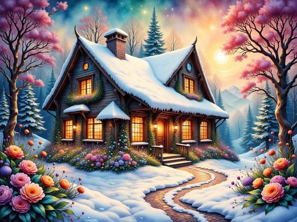 This image depicts a cozy, snow-covered cabin in a vibrant winter landscape. It features colorful flowers, snow-laden trees, and a sky with sparkling bokeh lights, rendered as a watercolor painting in a fantasy art style.