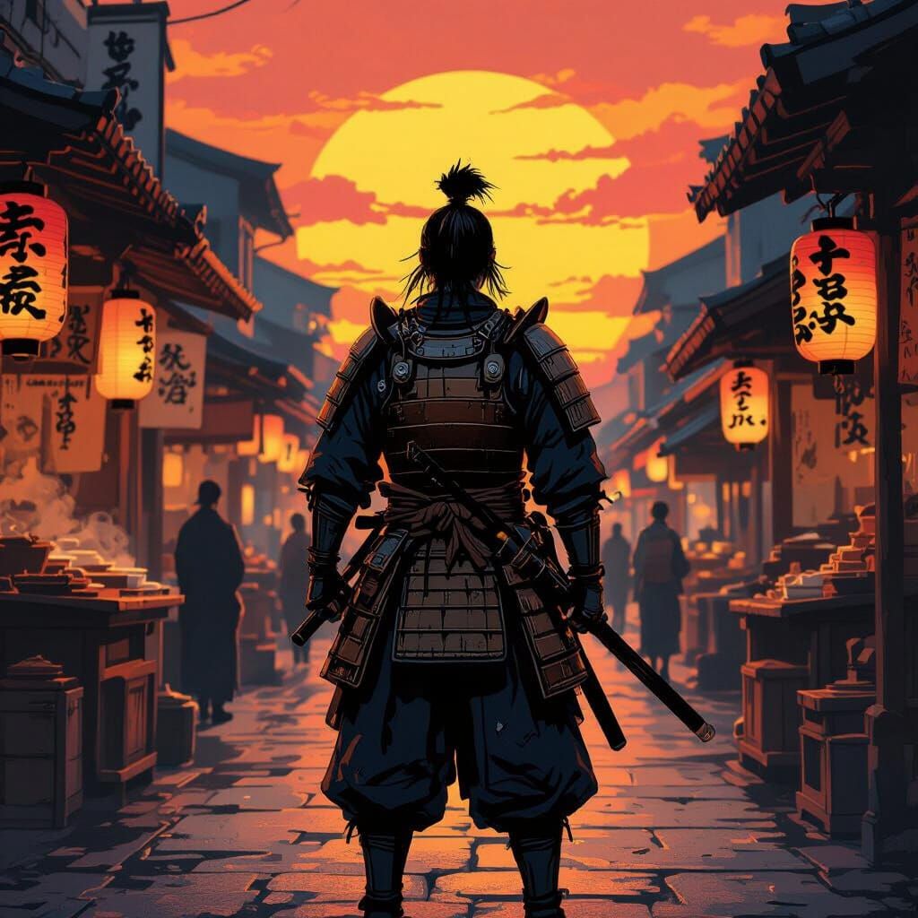 A lone samurai is silhouetted against a vibrant sunset in a busy Edo marketplace. The scene features wooden stalls and lanterns, rendered in a style inspired by Japanese woodblock prints.
