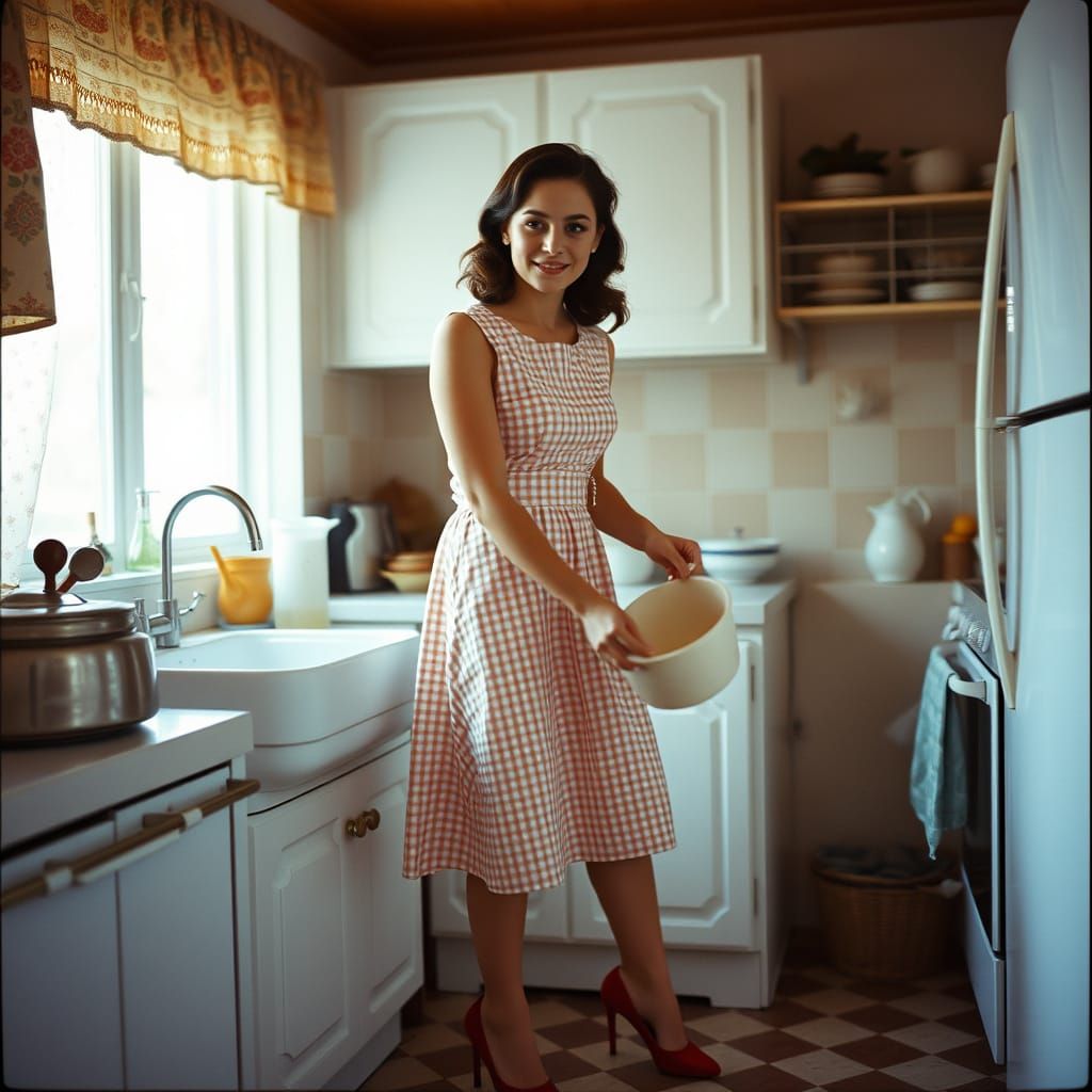 A captivating image of a young homemaker in a 1950s-inspired gingham dress, surrounded by warmth and domesticity. Shot in a cinematic style with film grain and vignette, evoking a sense of nostalgia and classic charm.
