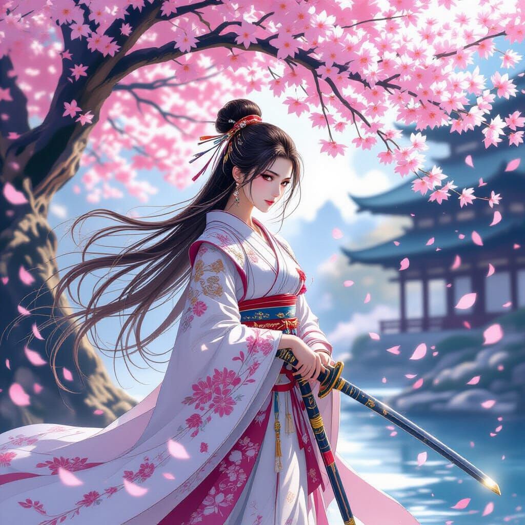 A striking picture of a noble samurai warrior beneath a cherry blossom. The image captures a magical, ethereal scene with spirit lights, flowers and divine proportions in an aetherpunk style.
