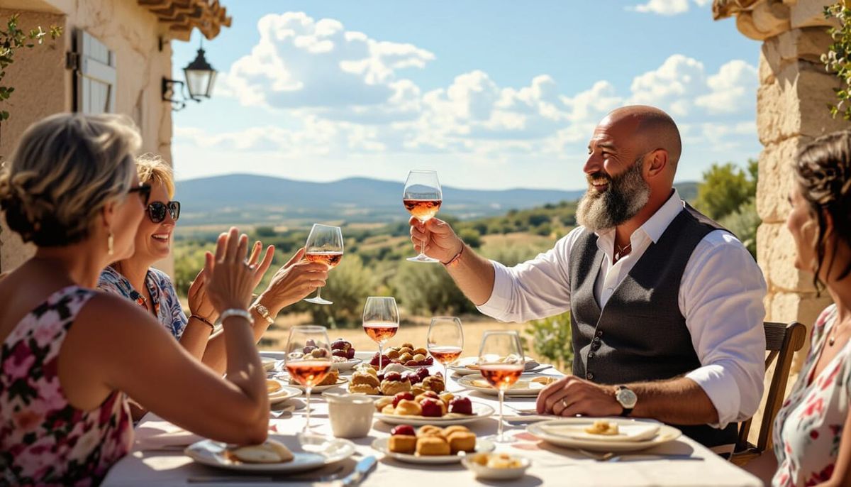 This image captures a celebratory outdoor toast at a Provençal farmhouse. A man raises a glass of wine as friends and family applaud, set in a sunny garrigue landscape, rendered with textured brushstrokes.