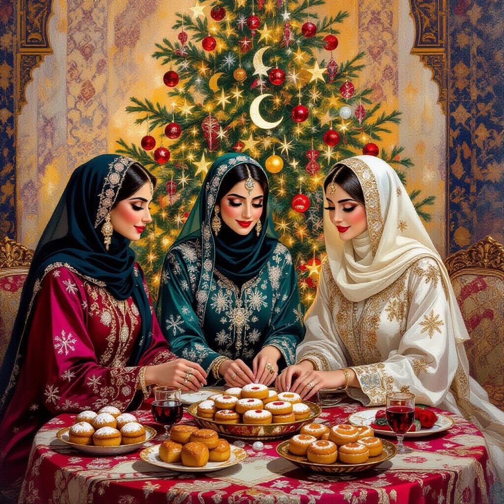 An opulent oil painting depicts an Arabian sultana celebrating Christmas with her sisters amidst Middle Eastern sweets and festive pastries. The scene features a decorated fir tree and warm lighting, evoking a royal holiday atmosphere.