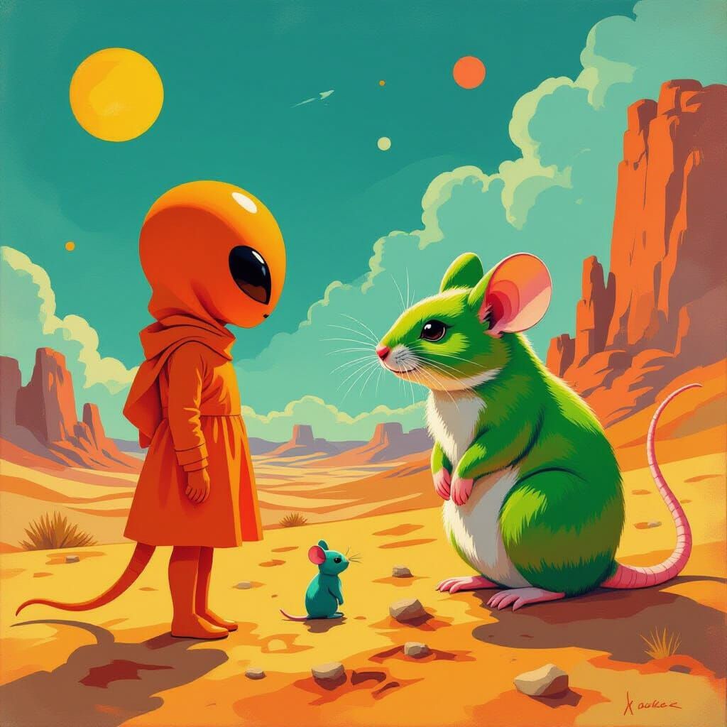 This image depicts an orange alien girl encountering a large green mouse on a desert planet. The artwork features a maximalist impressionist style with vibrant gouache and watercolor textures.