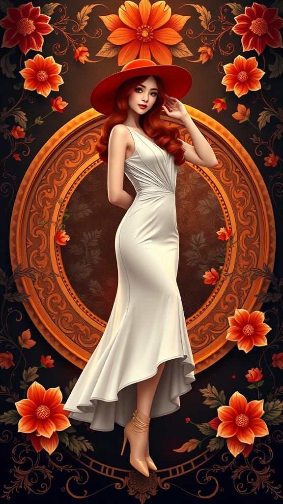 This image features a woman in a stunning white dress, adorned with a red hat and light beige boots, surrounded by intricate floral patterns and ornate details, set against a warm and vibrant backdrop, in a hyperrealistic 3D illustration style reminiscent of traditional art with a modern twist.