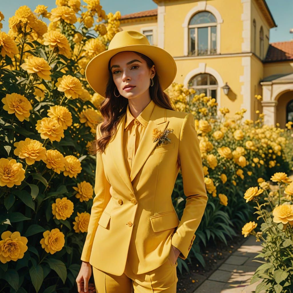 This image shows a full-body portrait of a woman in a yellow suit and hat, standing outdoors. The photograph, in a cinematic editorial style, captures warm natural light and vivid colors.