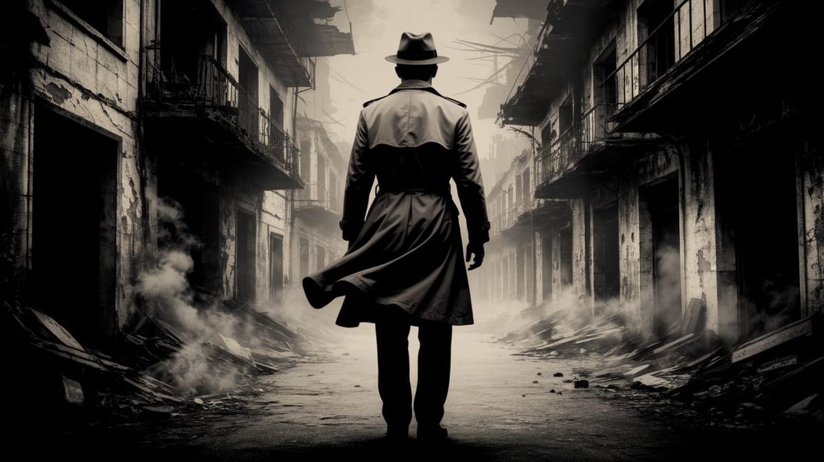 A haunting black and white image of a lone man in a fedora, standing amidst derelict buildings in a misty, rain-soaked street, evoking a sense of mystery and nostalgia