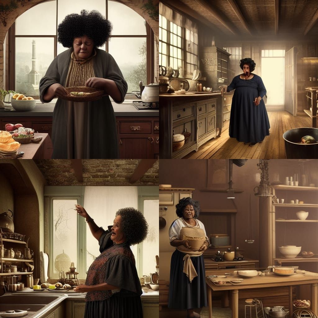 This image shows a vintage portrait of an elderly black woman in a kitchen. The image is a digital matte painting with cinematic, intricate details and dramatic lighting.