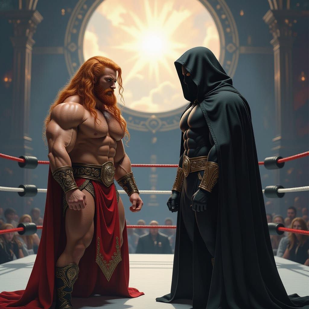 A dramatic image of a ginger-haired wrestler battling a shadowy figure in a cosmic ring. The scene features dynamic lighting, intricate details, and a sinister atmosphere, rendered with hyperdetailed textures.
