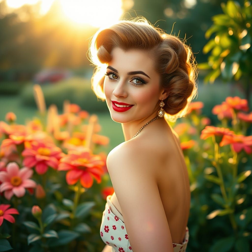 This vintage-style photograph features a 1950s pin-up model in a vibrant garden during golden hour. The scene evokes classic glamour with warm light and soft focus.