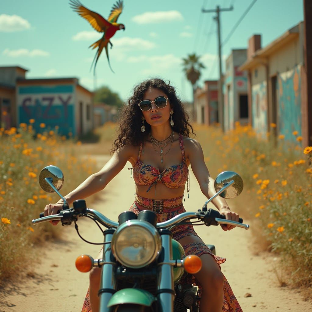 A vibrant image showing a Brazilian woman with sunglasses and jewelry riding a vintage motorcycle through a deserted town. The scene is filled with wildflowers and graffiti, in retro-surreal style.