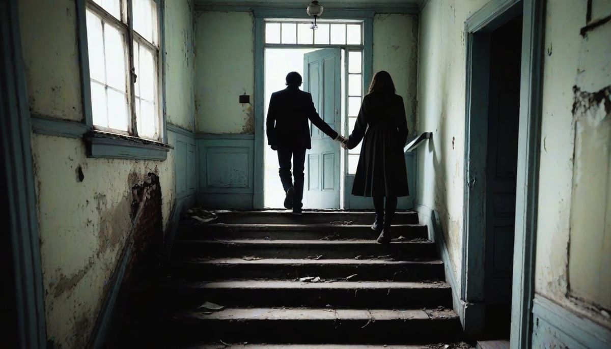 This AI-generated image evokes a somber mood, depicting an old, empty house and a solitary figure. The scene captures a feeling of unease and introspection, suitable for artistic or narrative themes.