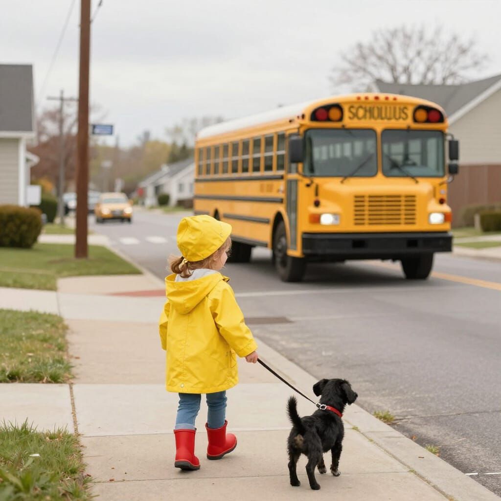 This image shows a young girl in a yellow raincoat and red boots walking her black puppy to a school bus on a suburban street. Rendered in a charming, illustrative style.