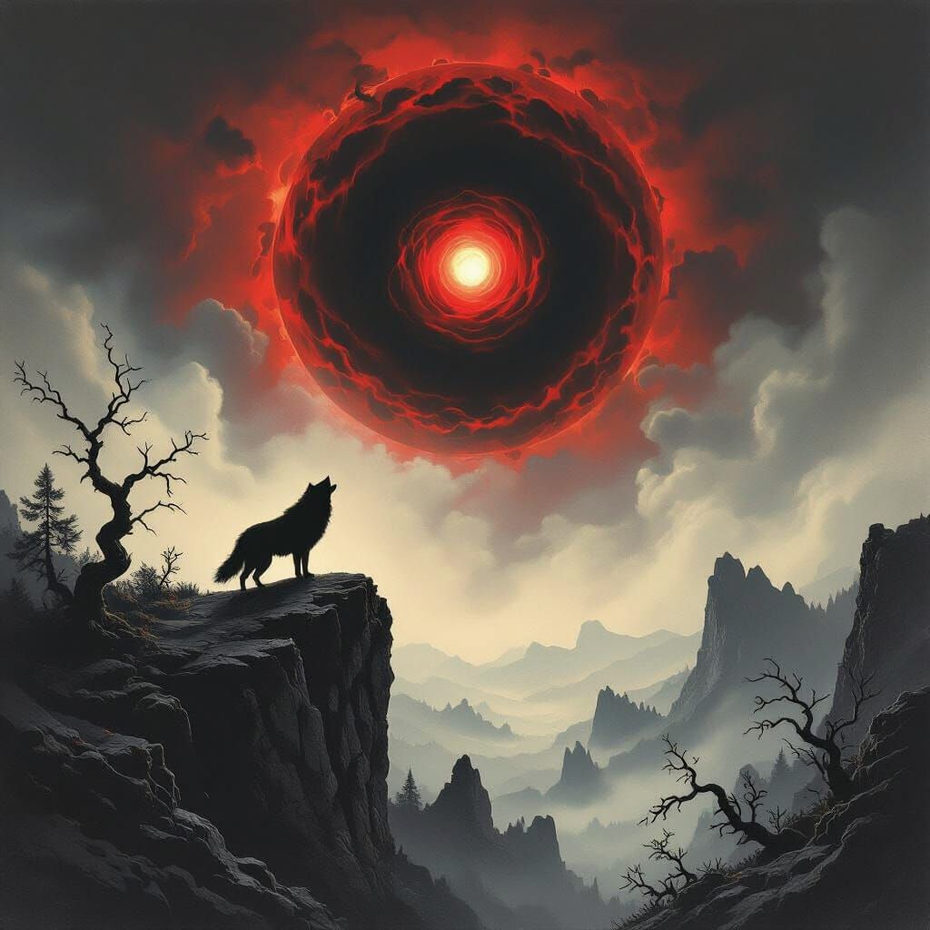 This image shows a lone wolf howling at a blood-red moon from atop a cliff. Spectral energy emanates upwards, with surreal, twisted landscape details in a dark fantasy style.
