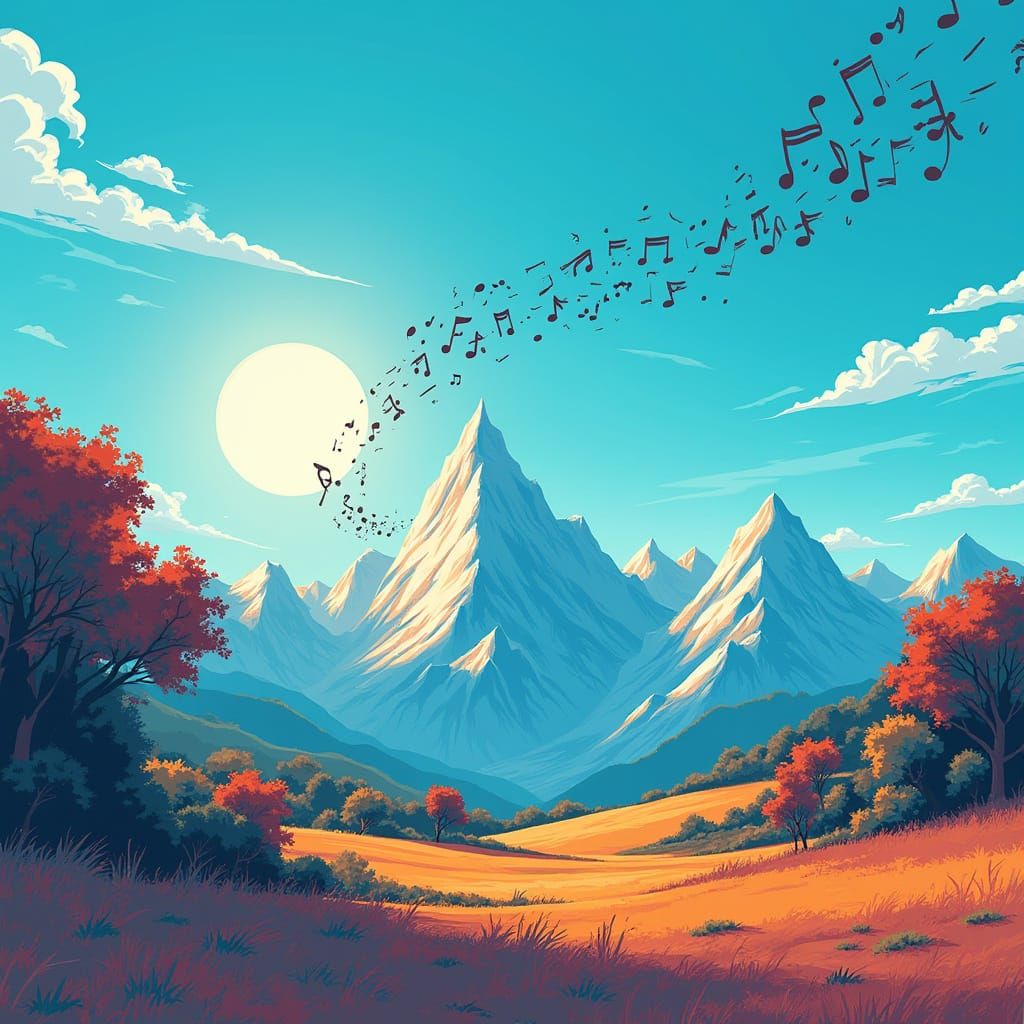A colorful banner promoting music lessons with a focus on string and keyboard instruments, set against a bright blue sky with majestic mountains reflecting golden sunlight. Musical notes fly through the air, creating a sense of movement and joy, in a dynamic and playful style inspired by Warhol and Hergé...