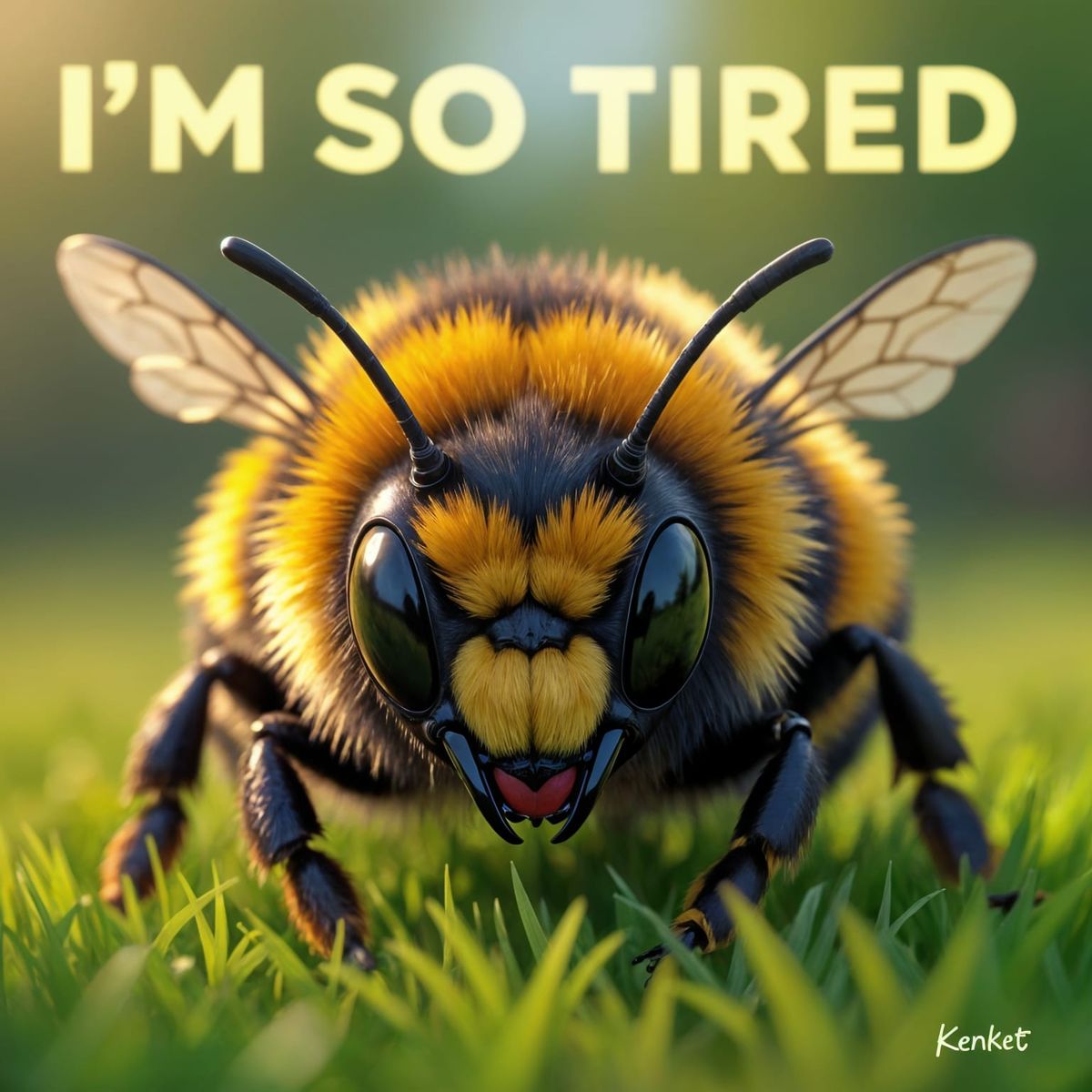 This image shows a detailed close-up illustration of Bumblebee's head, reminiscent of GoldenWolf and Kenket's styles. A large, stylized inscription reads "I'm so tired" above the subject.