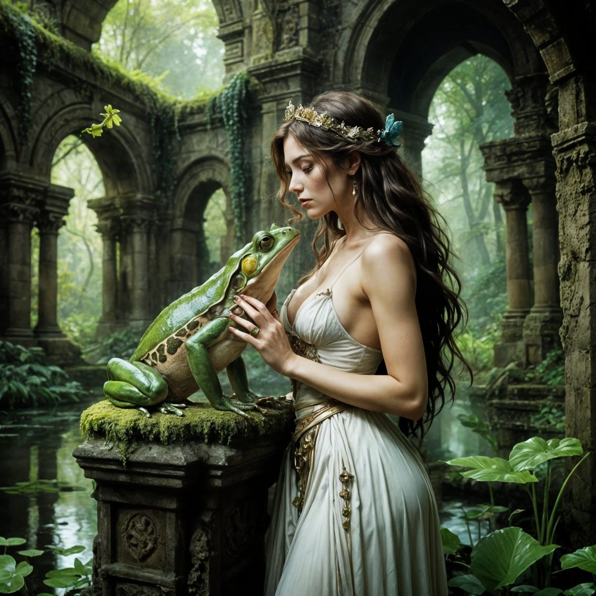 A striking image of a princess kissing a frog within a dark, medieval laboratory setting, featuring ancient ruins. Rendered in a detailed, complex anime style with vibrant colors.