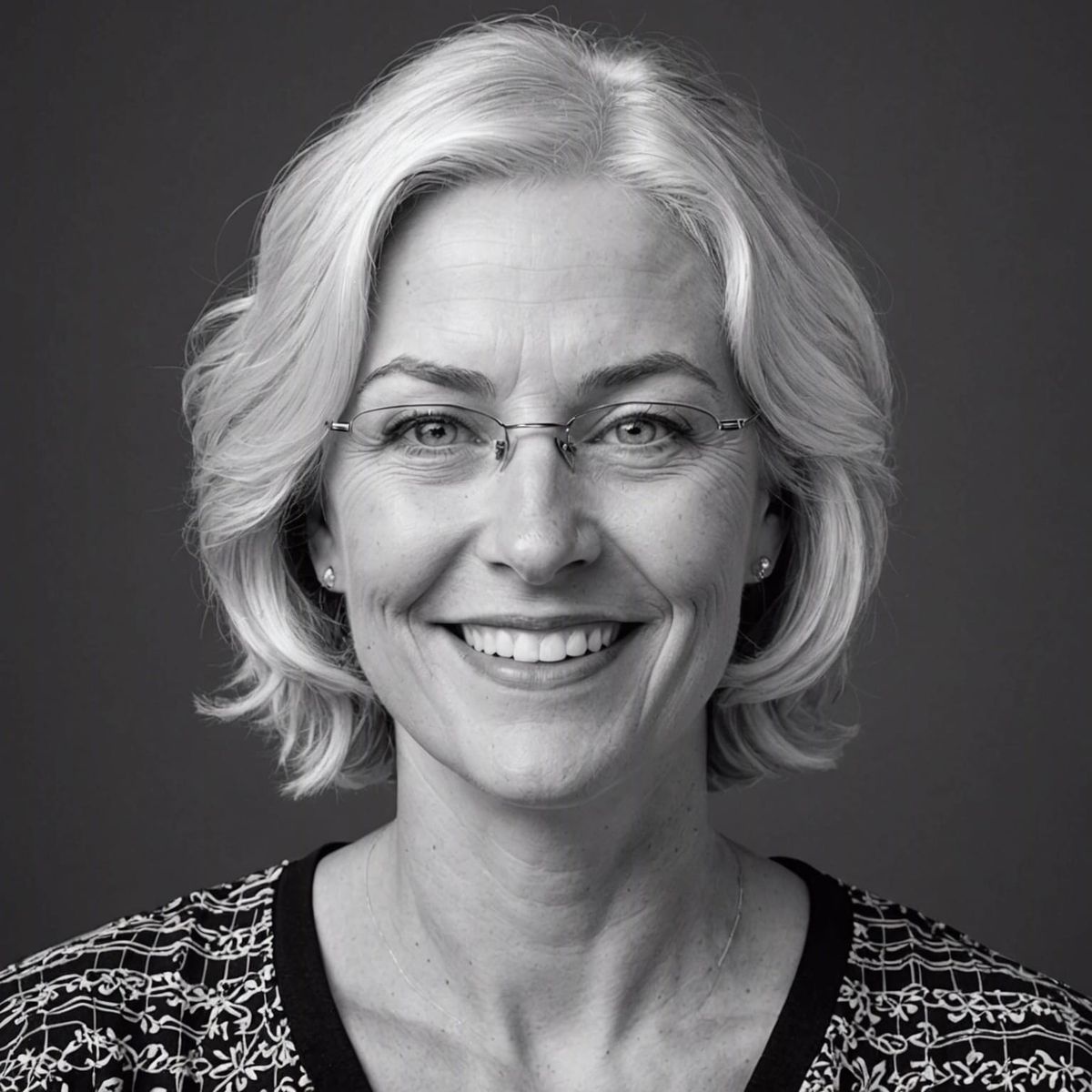 This black and white portrait depicts a smiling, friendly woman with blue eyes and short wavy white hair. The hyperdetailed airbrush art highlights her pleasant and creative nature.