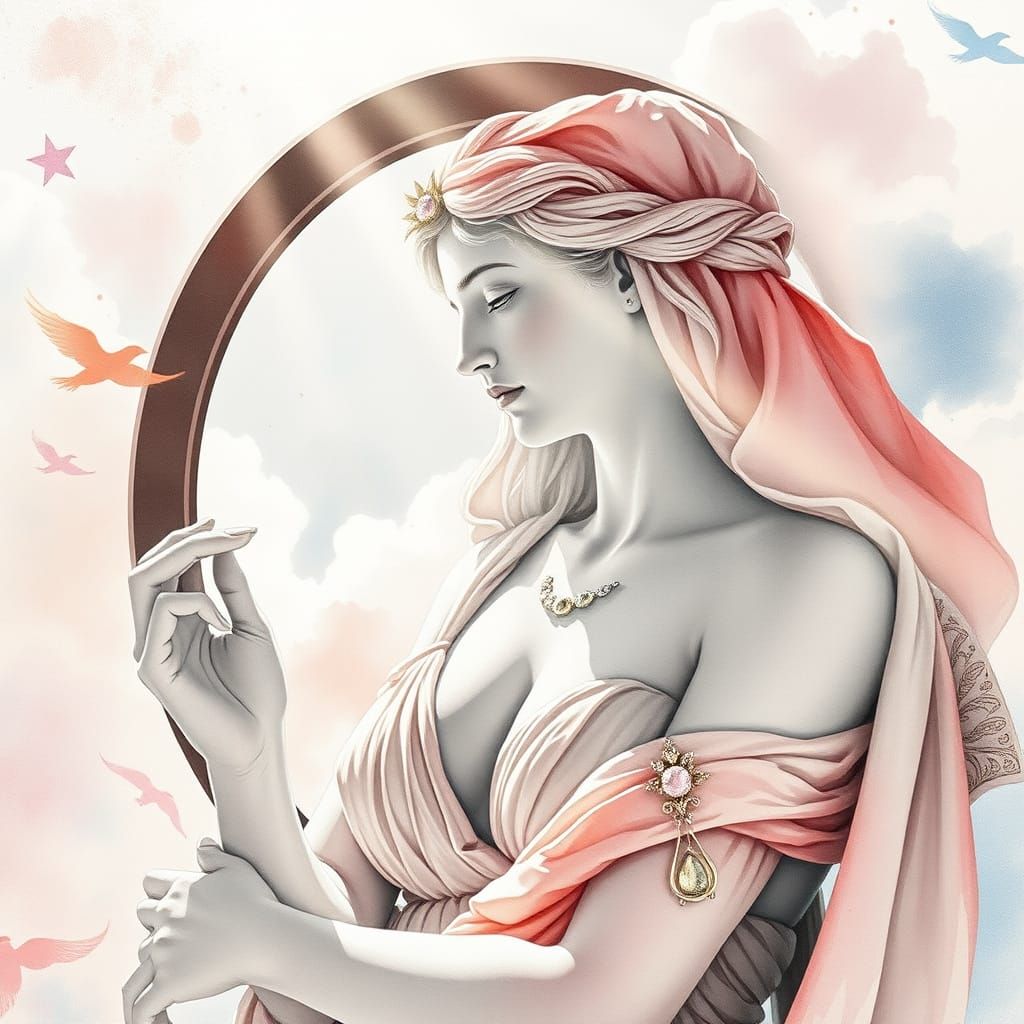 A monochrome watercolor of the Greek goddess Aphrodite looking in a mirror. Soft, heavenly sunshine streams through the clouds in this Botticelli-esque pastel artwork.